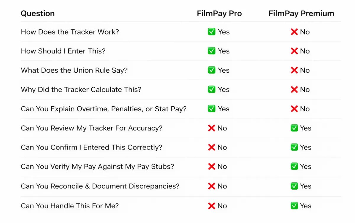 FilmPay Tracker + Pro Gives You a Simple Tracking System, Expert Guidance, Union Rule Clarity, and Private Support so You Always Know Exactly What Youโre Owed